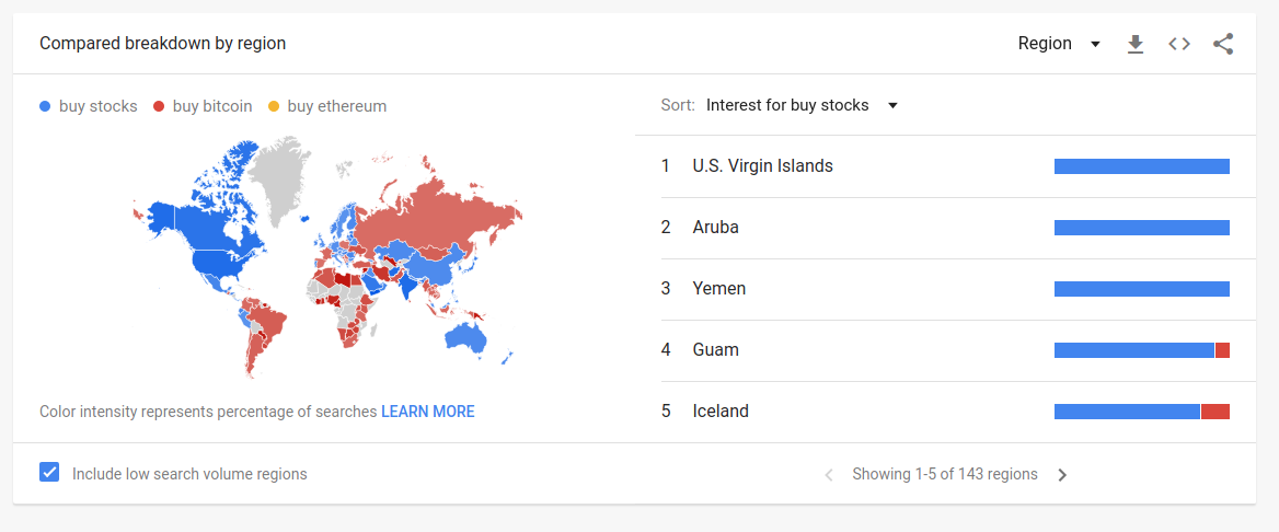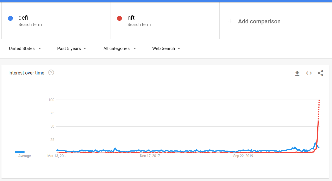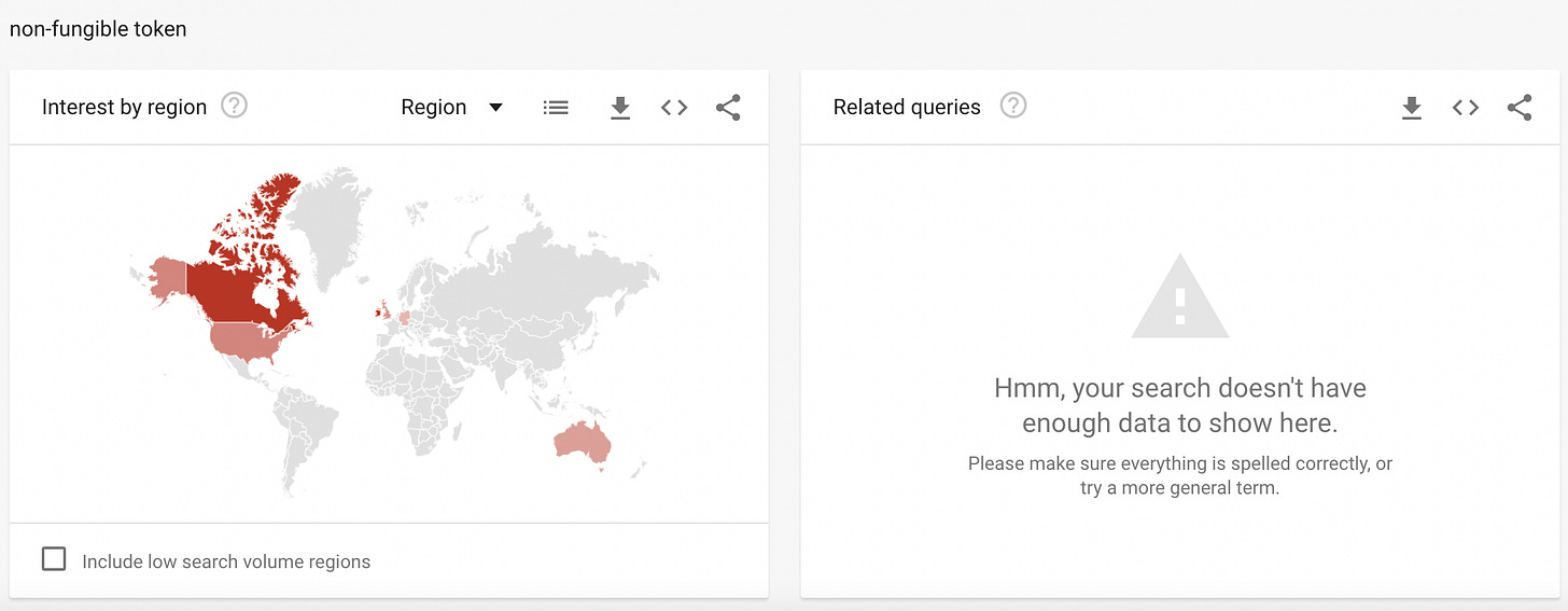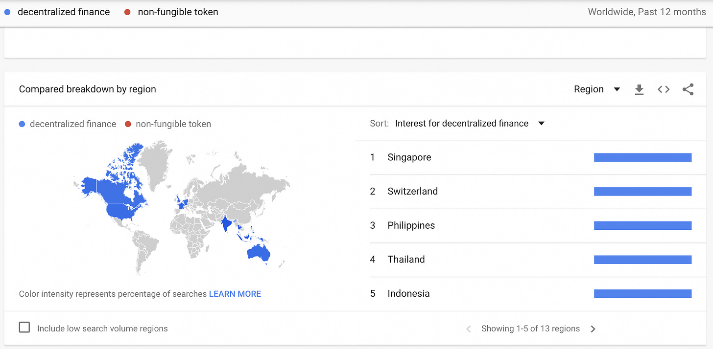 Google trends can be used to look at relative search volumes over different time frames and within different regions. Since Google Trends can show when interest is increasing in a given topic we can use it as a tool to examine mimetic behavior. Drill downs into related search terms are simple to perform and Google gives the options of pivoting on top related terms as well as most recent rising terms. Here we will use Google Trends to look at the amount of interest and where the interest is originating geographically for stocks, cryptocurrency, bonds, decentralized finance, non-fungible tokens, and startups. Data from Google Trends will be presented to the extent possible without interpretation.