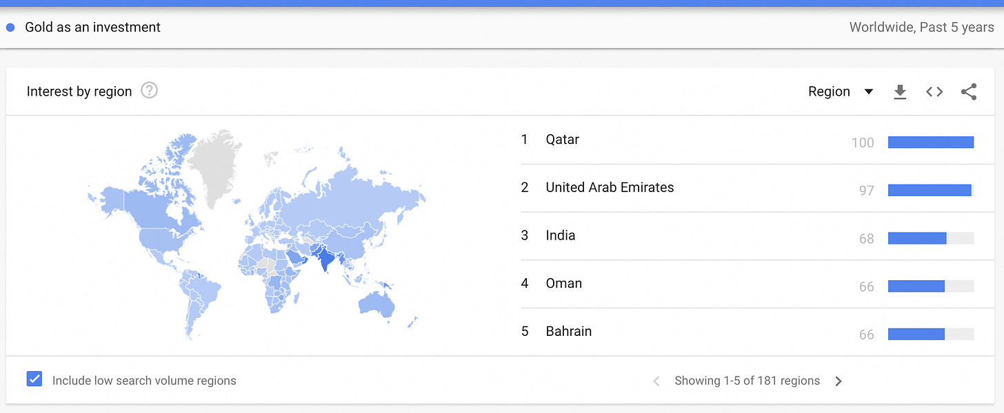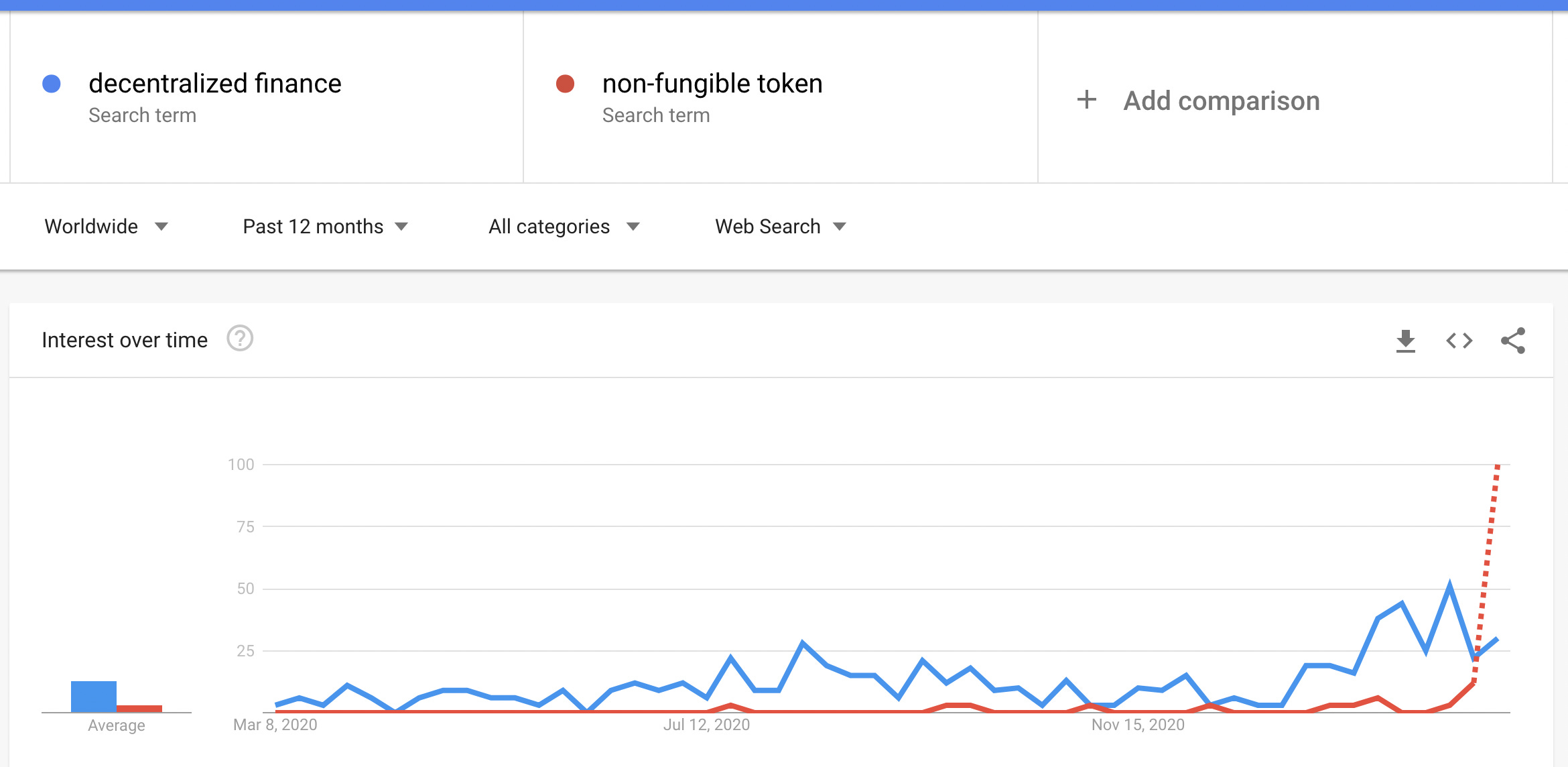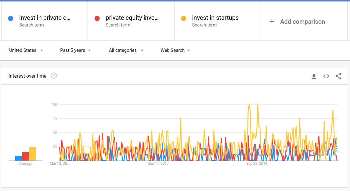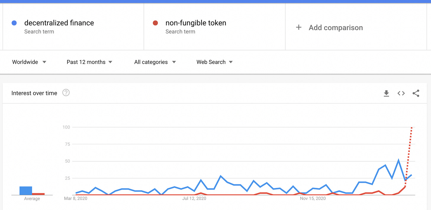 Google trends can be used to look at relative search volumes over different time frames and within different regions. Since Google Trends can show when interest is increasing in a given topic we can use it as a tool to examine mimetic behavior. Drill downs into related search terms are simple to perform and Google gives the options of pivoting on top related terms as well as most recent rising terms. Here we will use Google Trends to look at the amount of interest and where the interest is originating geographically for stocks, cryptocurrency, bonds, decentralized finance, non-fungible tokens, and startups. Data from Google Trends will be presented to the extent possible without interpretation.