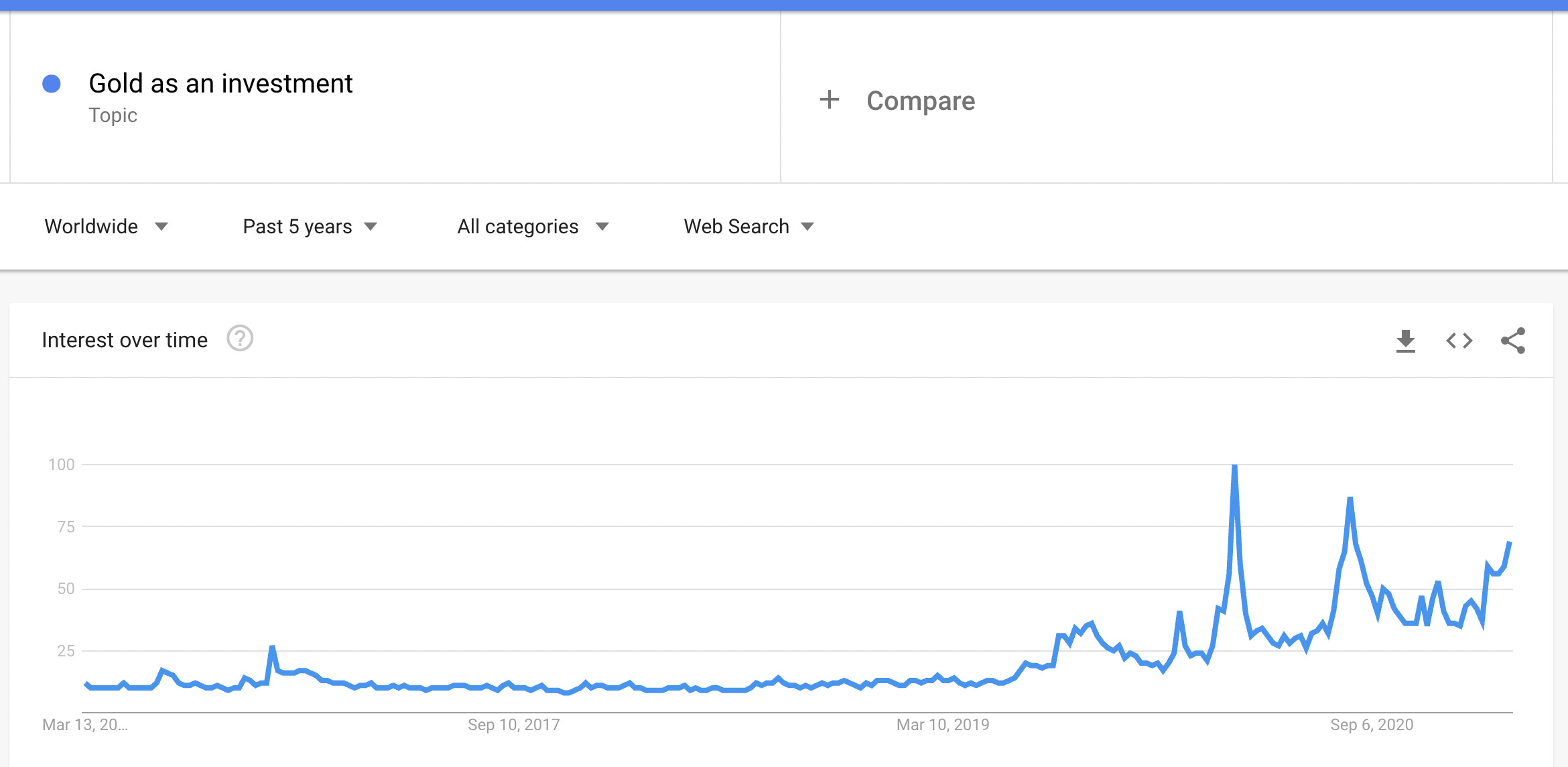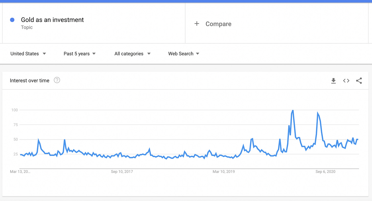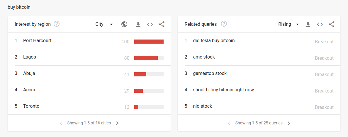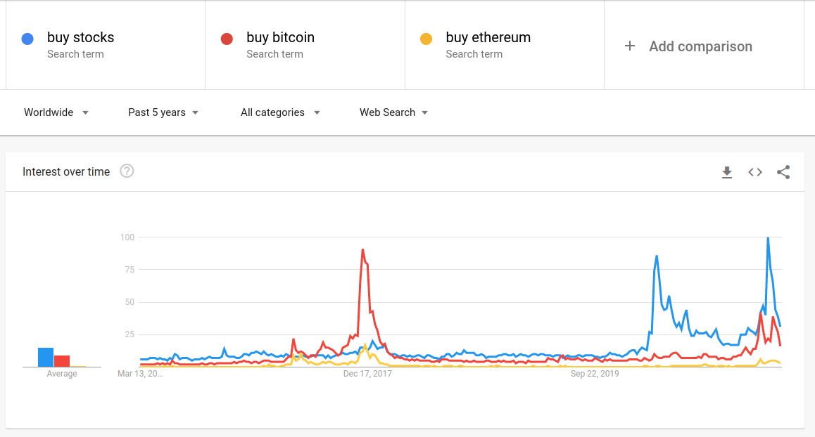 Google searches globally for “buy stocks” and related terms surged in March of last year and again at the end of January 2021. Bitcoin interest had surged in December 2017.