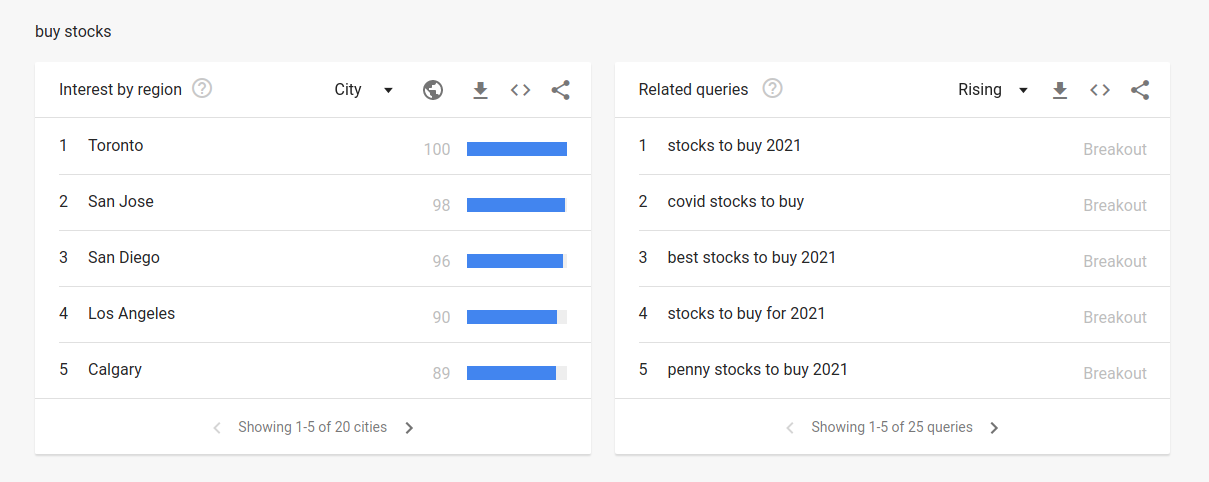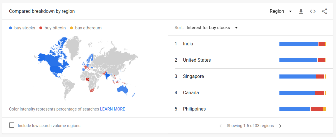 Top regions and cities for searches for “buy stocks” and related queries (12 Months)