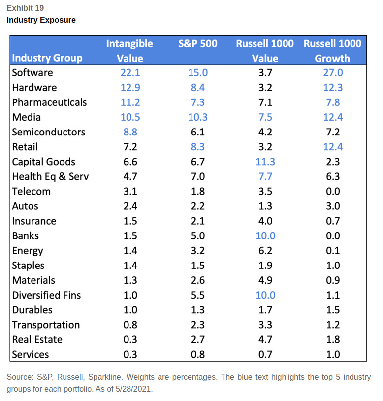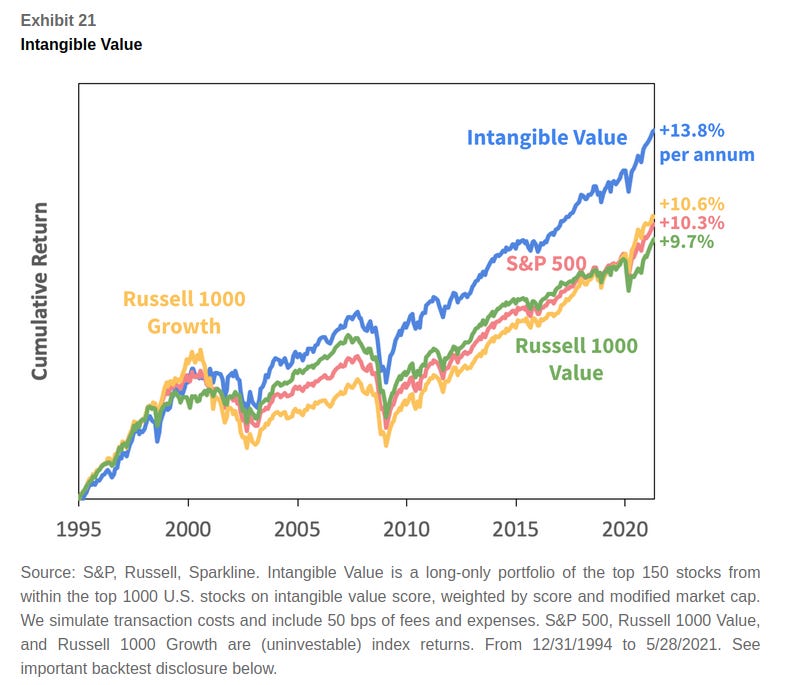 “We find that the Intangible Value portfolio would have outperformed the S&P 500. Interestingly, despite currently having factor exposures in between those of Russell 1000 Value and Growth, it would have also outperformed both.”