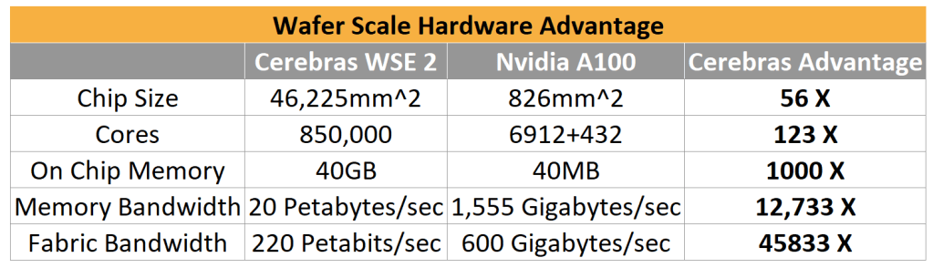 The Cerebras WSE is actually many chips on a wafer within the confines of the reticle limit. Instead of cutting the chips apart along the scribe lines between chips, they developed a method for cross die wires. These wires are patterned separately from the actual chips and allow the chips to connect to each other. In effect, the chip can scale beyond the reticle limits.”