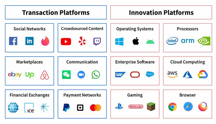 They split platforms into two categories, transaction platforms and innovation platforms. Transaction platforms are intermediaries for direct exchanges or transactions (Facebook, AirBNB, VISA, YouTube, Zoom being examples). Innovation platforms are platforms that provide a tech foundation that other firms develop complementary innovations on. Examples include operating systems, semiconductors, cloud computing, gaming, and web browsers. Admittedly I could see some companies like Amazon falling into both categories.