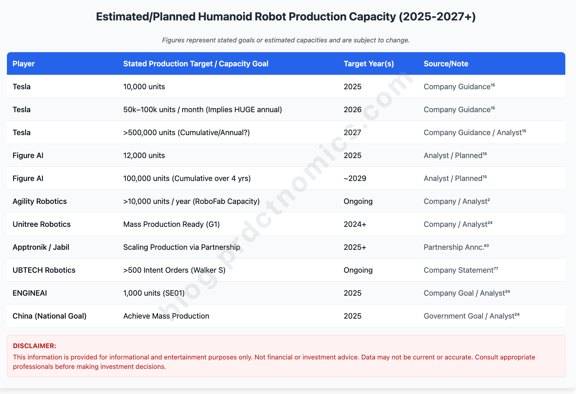 The production targets being thrown around are staggering. Agility aims for over 10,000 robots annually.² Tesla talks about scaling to potentially over half a million Optimus units per year within just a few years.¹⁵ Figure AI has similar ambitions.¹⁵ These numbers represent an exponential leap from current boutique production levels.