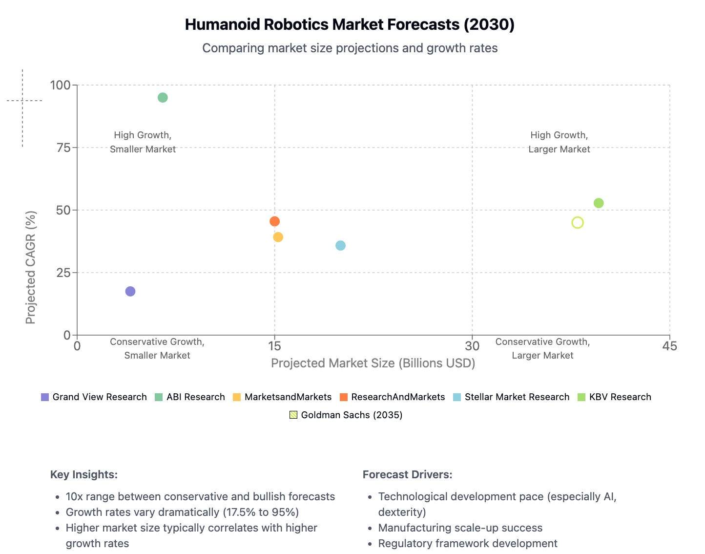 Market forecasts, as we've seen, are all over the map – from $4 billion to $40 billion – reflecting fundamental uncertainty.¹⁸, ²⁵ Goldman Sachs analysts predict over 250,000 units shipped in 2030, mostly for industrial use, implying a substantial market is forming.²⁸ But achieving even the mid-range forecasts requires significant progress on multiple fronts.